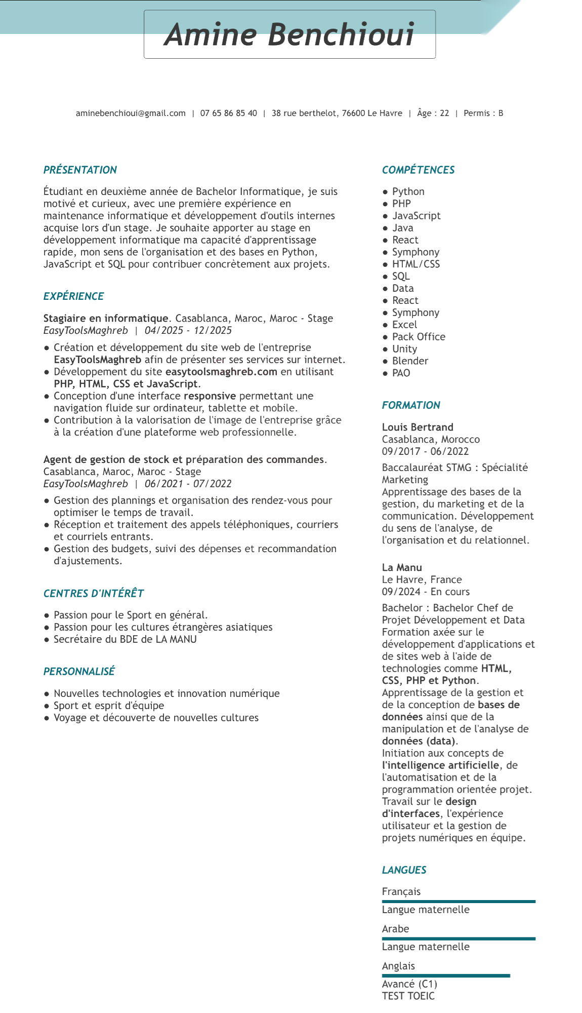 Actuellement étudiant international à La Manu, à Le Havre, je poursuis depuis 2 ans mes études en Bachelor en tant que Chef de projet : Data & IA.